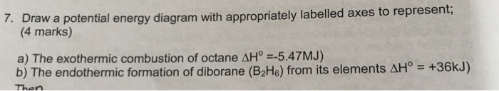 View Draw A Potential Energy Diagram With Appropriately Labelled Axes To Represent Pictures. Therefore, looking at the potential energy diagram, the reactants are usually found to the left on the diagram and the products. A) the exothermic combustion of octane b) the endothermic formation of diborane (b2h6) from its elements.